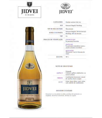 La început a fost vinul. Adică soarele, pământul, viile. Un vin tânăr, cu aciditatea specifică podgoriei din inima Transilvaniei. Apoi, l-am distilat și învechit cel puțin trei ani în butoaie de stejar. Astfel, am creat acest vinars – armonios, puternic și echilibrat ca spiritul oamenilor de pe Târnave. Vinars Jidvei VS își dezvăluie pe deplin aromele fine de caramel, vanilie și notele delicate de condimente exotice atunci când este turnat ritualic într-un pahar cu pântec rotund, în formă de lalea, încălzit în căușul palmelor și savurat la temperatura camerei. Ritualul se va încheia cu un postgust armonios, stăruitor și greu de uitat.
