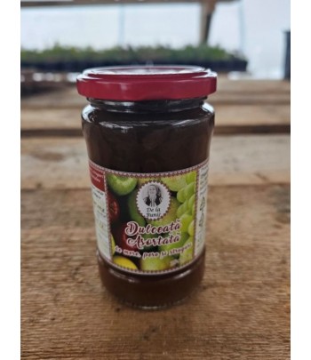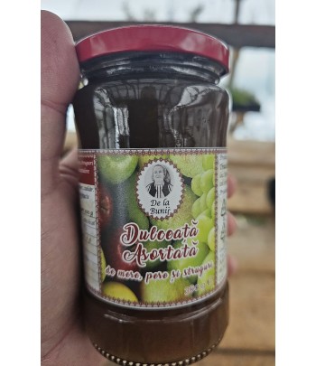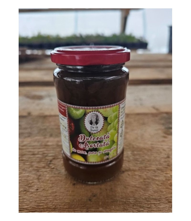 Ingrediente: mere, pere, struguri, zahăr. Preparat cu minimum 58 grame de fructe pentru 100 gr de produs finit obținut.