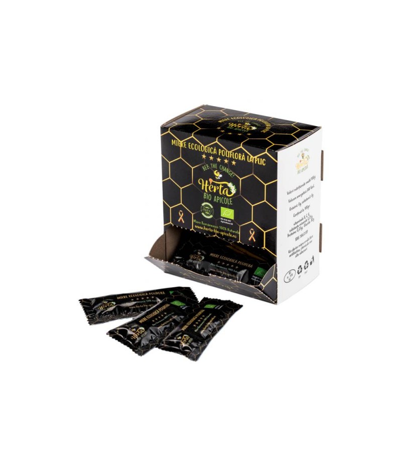 Miere BIO poliflora la plic este solutia ideală pentru domeniul HORECA. Mierea poliflora este un aliment complet, poate cel mai complet aliment natural din cate exista. Este compusa din zaharuri simple, fructoza, glucoza, vitamine din complexul B, vitamina C, enzime si minerale. Culoarea mierii diferă în funcţie de plantele din care albinele au cules nectarul necesar. În prima parte a verii, când peisajul este presărat cu flori vesele şi culori foarte deschise, mierea polifloră recoltată are tendinţa să fie mai deschisă la culoare. Spre sfârşitul verii, câmpurile, dealurile, fâneţele sunt pline de flori mai inchise la culoare. Din aceste flori, albinele recoltează nectar din care prepară mierea polifloră mai închisă la culoare. Mierea polifloră are gust și aromă puternică.