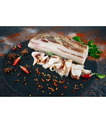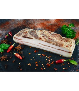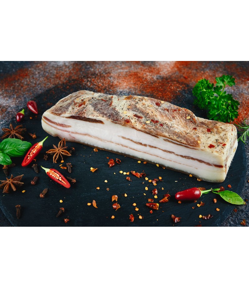SLĂNINĂ DE PORC MANGALIȚA (origine RO), sare de mare 3%, condimente naturale în proporție variabilă (piper negru, ardei iute fulgi, cuișoare, scorțișoară, nucșoară).