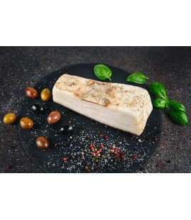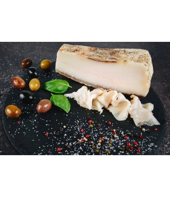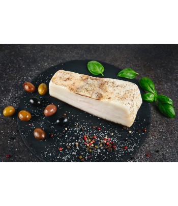 SLĂNINĂ DE PORC MANGALIȚA (origine RO), sare de mare 3%, condimente naturale în proporție variabilă (piper negru, praf de usturoi, cuișoare, scorțișoară, nucșoară).