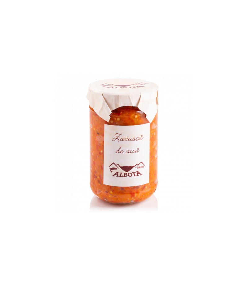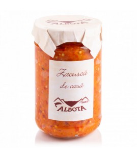 Zacusca Albota e făcută dintr-o selecție de legume zdravene, coapte la foc de lemne și-apoi aromate dup-o rețetă proprie de ierburi și mirodenii.